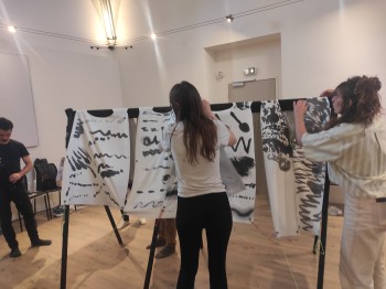 L’atelier a commencé en douceur, par l’écoute de différents sons, sans images pour faire naître le lien entre ouïe et vue. Les jeunes ont ensuite inventé leurs propres phrases sonores, à l’aide de petits objets (bouts de fer, bidons, baguettes, etc.) et de voix enregistrées au micro. Pendant qu’Oï les Ox transformaient ces sons en musique live, Jeanne proposait de les traduire en partitions sensibles à l’encre sur tissu, explorant formes, textures et mouvements. Les participant·es ont pu expérimenter, lâcher prise et laisser parler leur imagination à travers chaque geste.