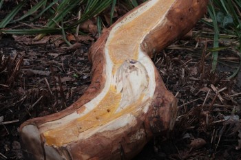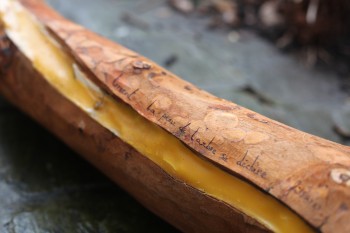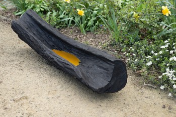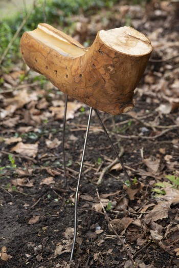 D’autres œuvres, de plus petite taille, suivent le tracé de son cheminement souterrain. Ce sont des souches de bois creusées à cœur et traversées par un flot de cire d’abeille.